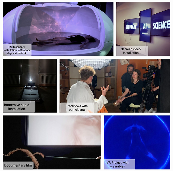 Our research manifests through diverse media: a three-screen video installation juxtaposing human, scientific, and AI perspectives on disembodiment; a multi-sensory installation within a sensory deprivation tank; immersive audio works using bone conduction sound; documentary portraits intertwining personal stories of bodily loss with scientific investigations into consciousness; and VR projects incorporating wearable technologies. Each experiment functions as both artwork and research apparatus—testing how sensory disruption, narrative framing, and technological mediation reshape bodily awareness and self-perception.